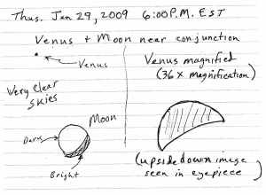Because Venus and Mercury are “inner” planets, meaning they are closer to the Sun than we are, they both show “phases” like our Moon. When Venus first appears as an evening “star” it is almost “full moon” shaped. And then as it gets higher in the sky during the following weeks, it gets slimmer and slimmer in a crecent shape, but it gets brighter and larger in diameter as it draws closer to the earth in its orbit. Compare the sketch made two weeks ago: Jan.29 sketch, with tonights sketch: